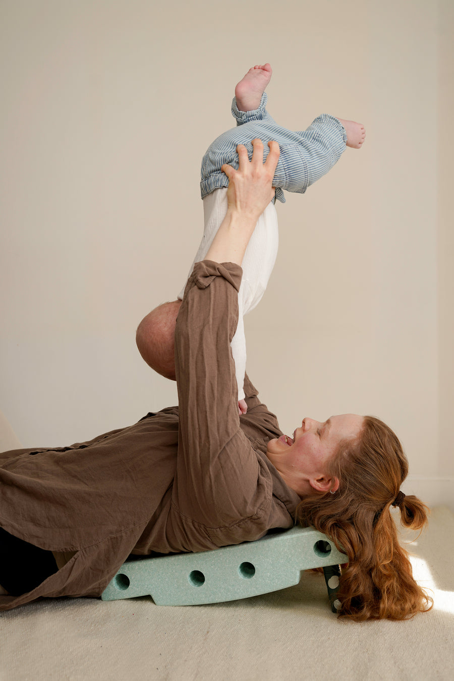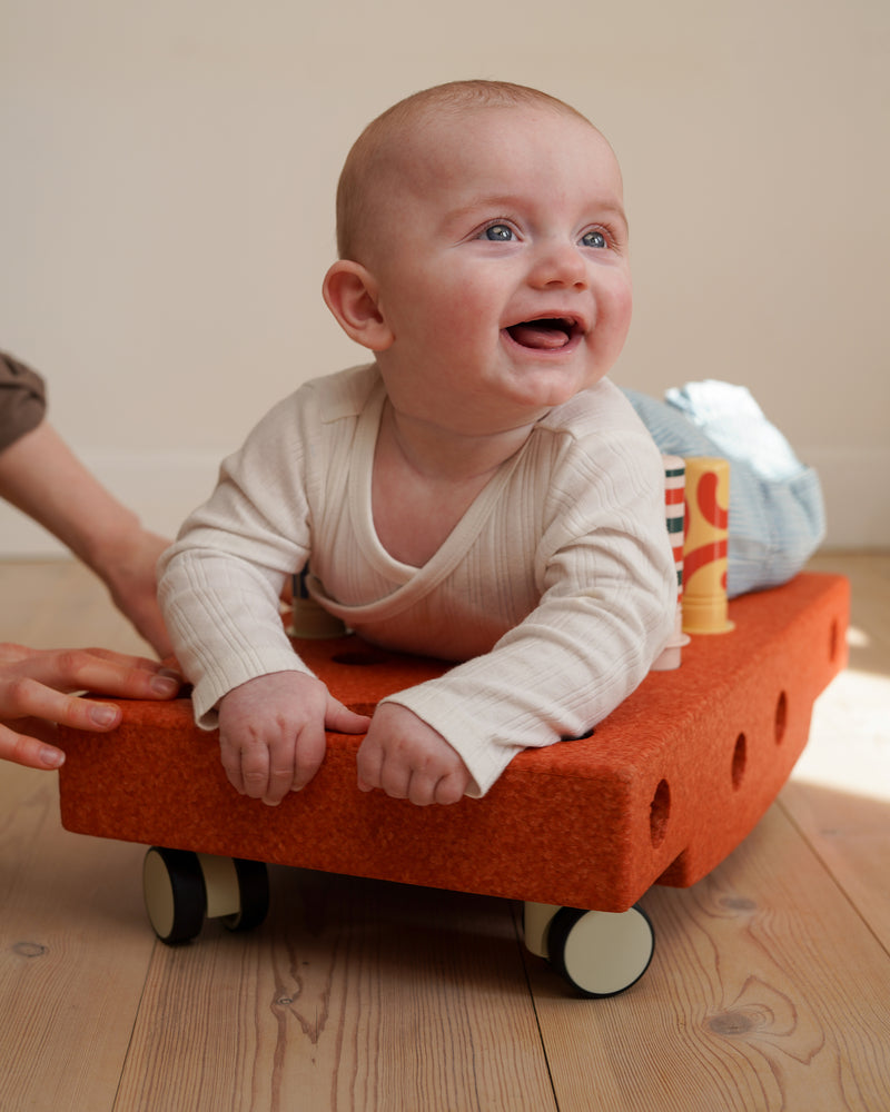 Once your baby has gained confidence lying on a flat surface and lifting their head, it's time to introduce more engaging challenges. Add some excitement and test their balance by placing them on a Scooter Board using the MODU Base Block and the MODU Swirly Wheels. Begin gradually, ensuring a slow increase in speed and changes of direction. Utilizing pegs as support and handles will help keep your baby secure throughout the activity.