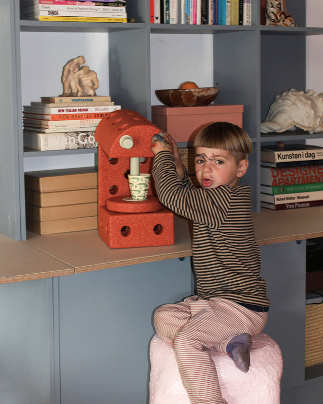 We often bring the toy to our holiday home for weekends and short trips. We build a wheelbarrow like the one dad has, and Eskild follows close behind him, his little toes patterning along, collecting bits of garden waste. Or we build a coffee machine that sets the stage for Freddie’s own little café. I really like how the blocks offer so many different possibilities for all different kinds of play.